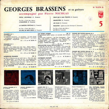 | Crédits complémentaires : | Paroles de Georges Brassens sauf indications Musiques de Georges Brassens Accompagné par Pierre Nicolas A2, A4, B5 : du film « Porte des Lilas » |